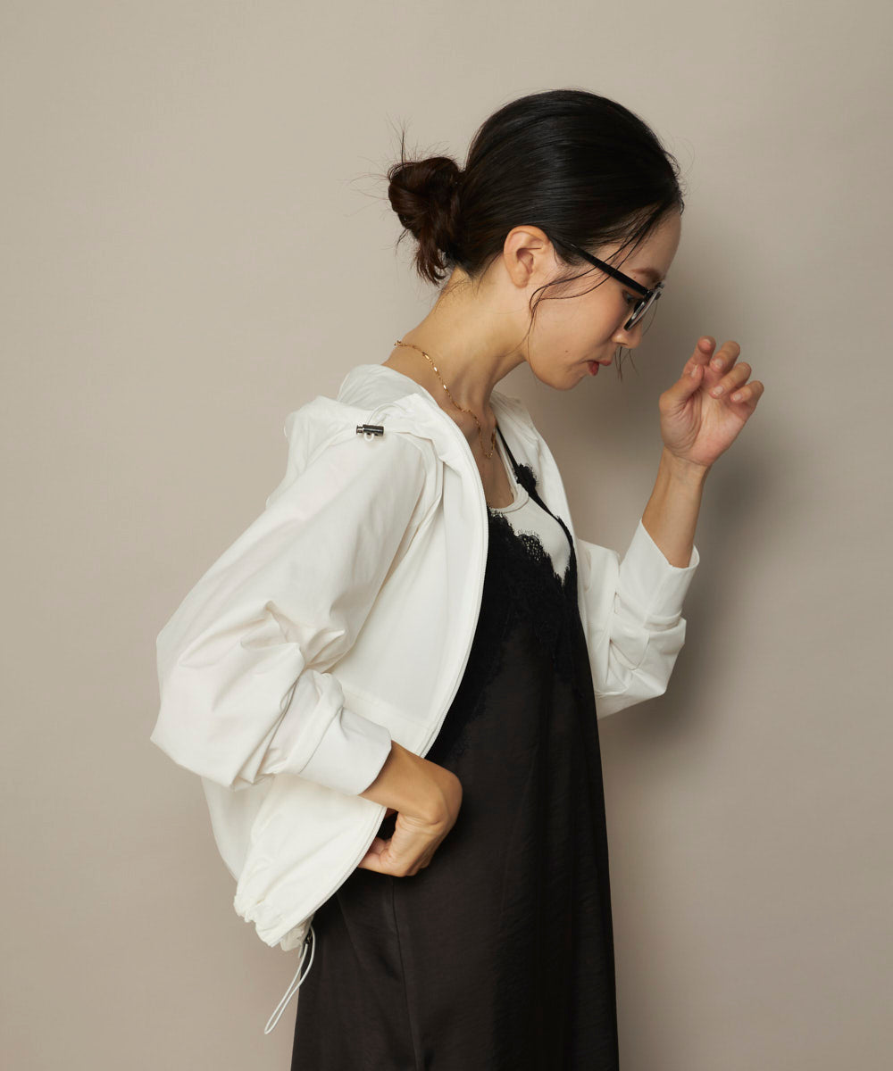 ハイネックフードにドローストリングコードがつき、裾口にもコードがついている仕様で、シルエットをお好みに合わせて変えられます。