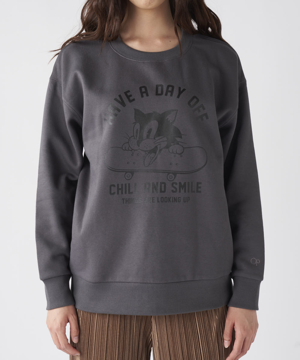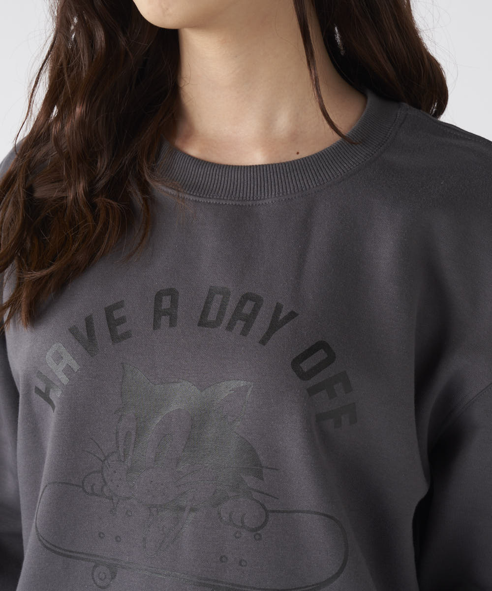ポップな猫のスケートボードグラフィックと「HAVE A DAY OFF」のメッセージが、リラックスムードを演出。