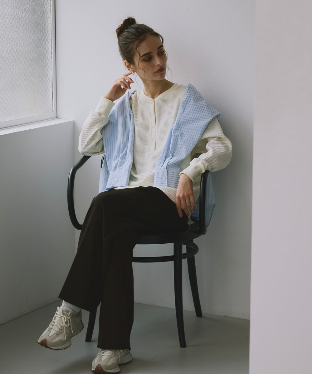 ヘンリーネックのデザインがこなれ感を演出し、大人のカジュアルスタイルにぴったり。