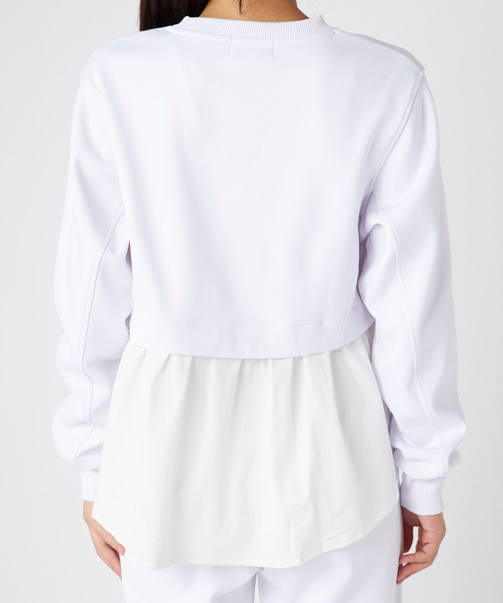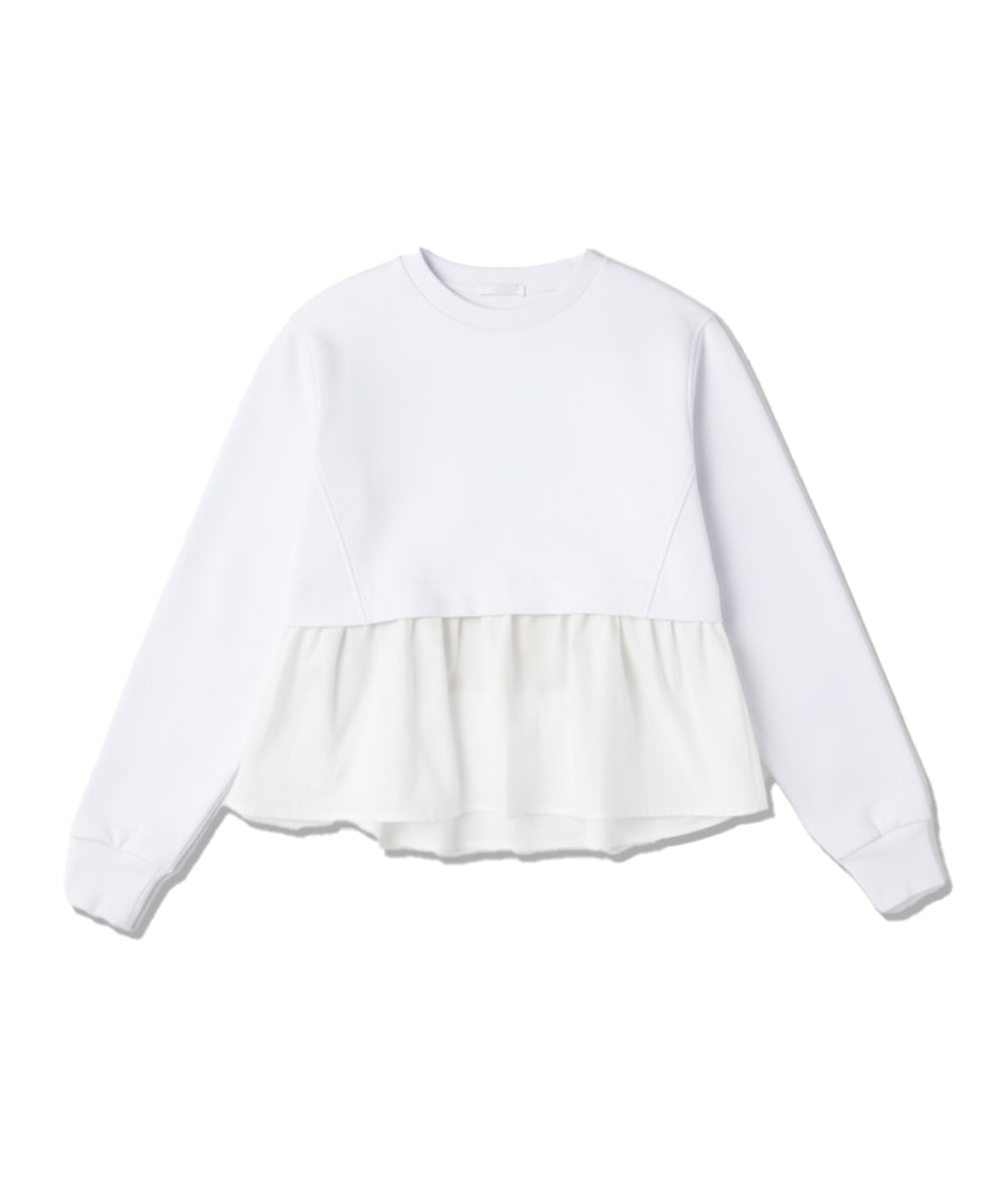 ダンボールニットの程よいハリと立体感に、布帛素材を組み合わせたデザインは、1枚でレイヤードスタイルが完成する優秀アイテム◎