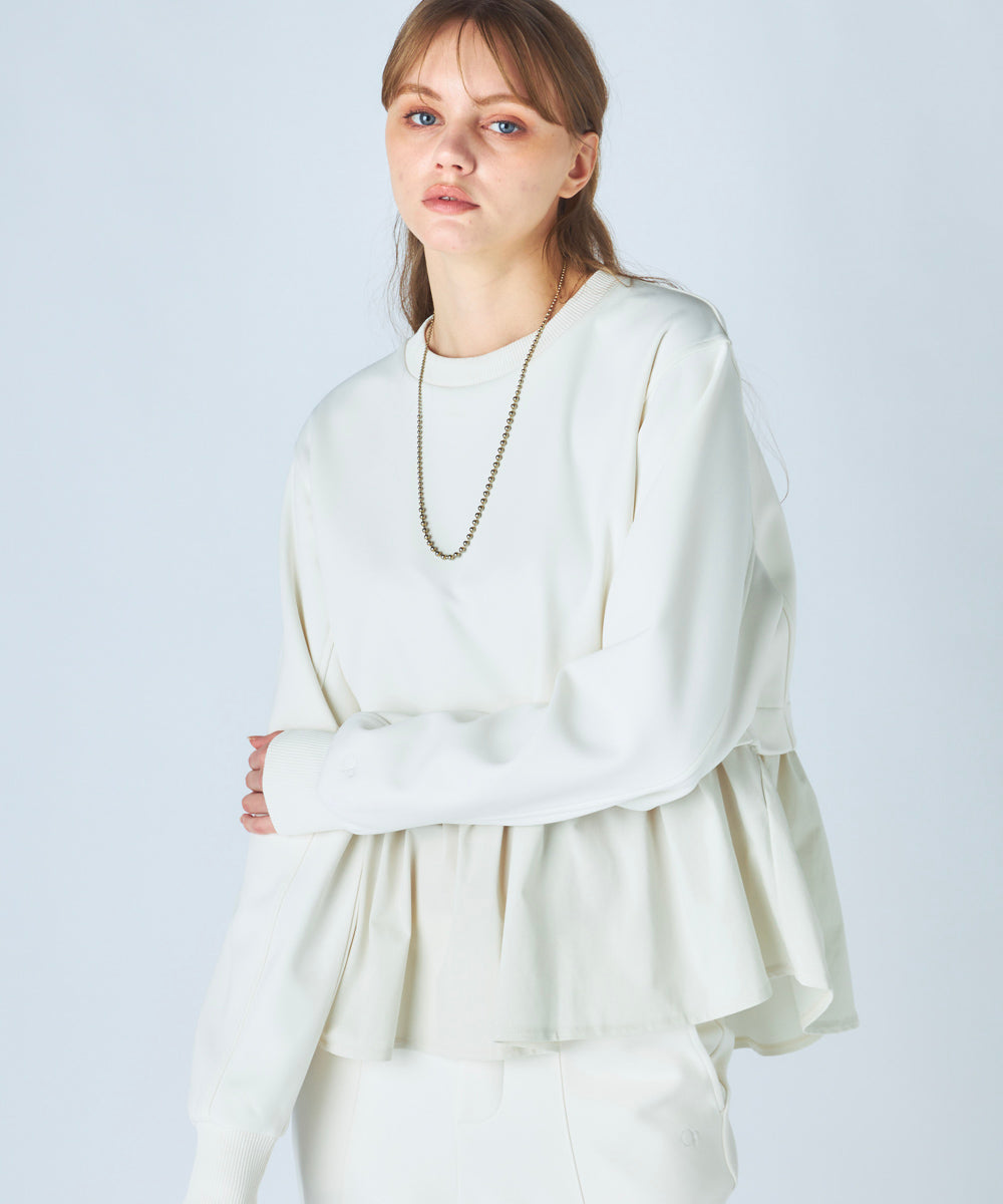 ダンボールニットの程よいハリと立体感に、布帛素材を組み合わせたデザインは、1枚でレイヤードスタイルが完成する優秀アイテム◎