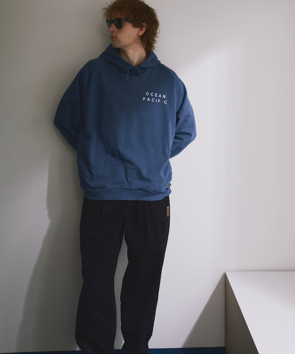 フロントはミニマルOCEAN PACIFICのロゴ、フーディー部分にさりげないデザインが施され、後ろ姿にもこだわりを魅せます。