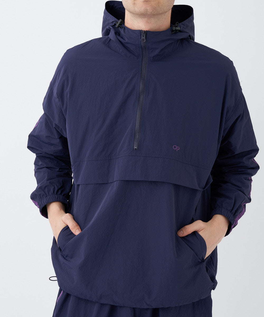 配色のラインとOPロゴ刺繍がかわいいユニセックスのナイロンアノラックジャケット。