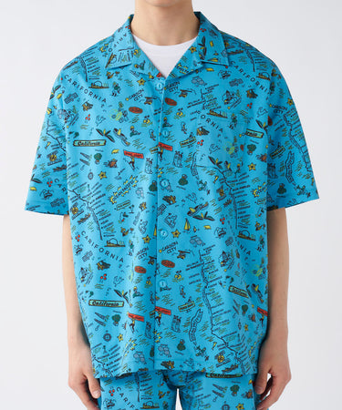 地図のような総柄デザインがひときわ目を惹くデザインで、リゾート感溢れる開襟シルエットが魅力的な一枚に。