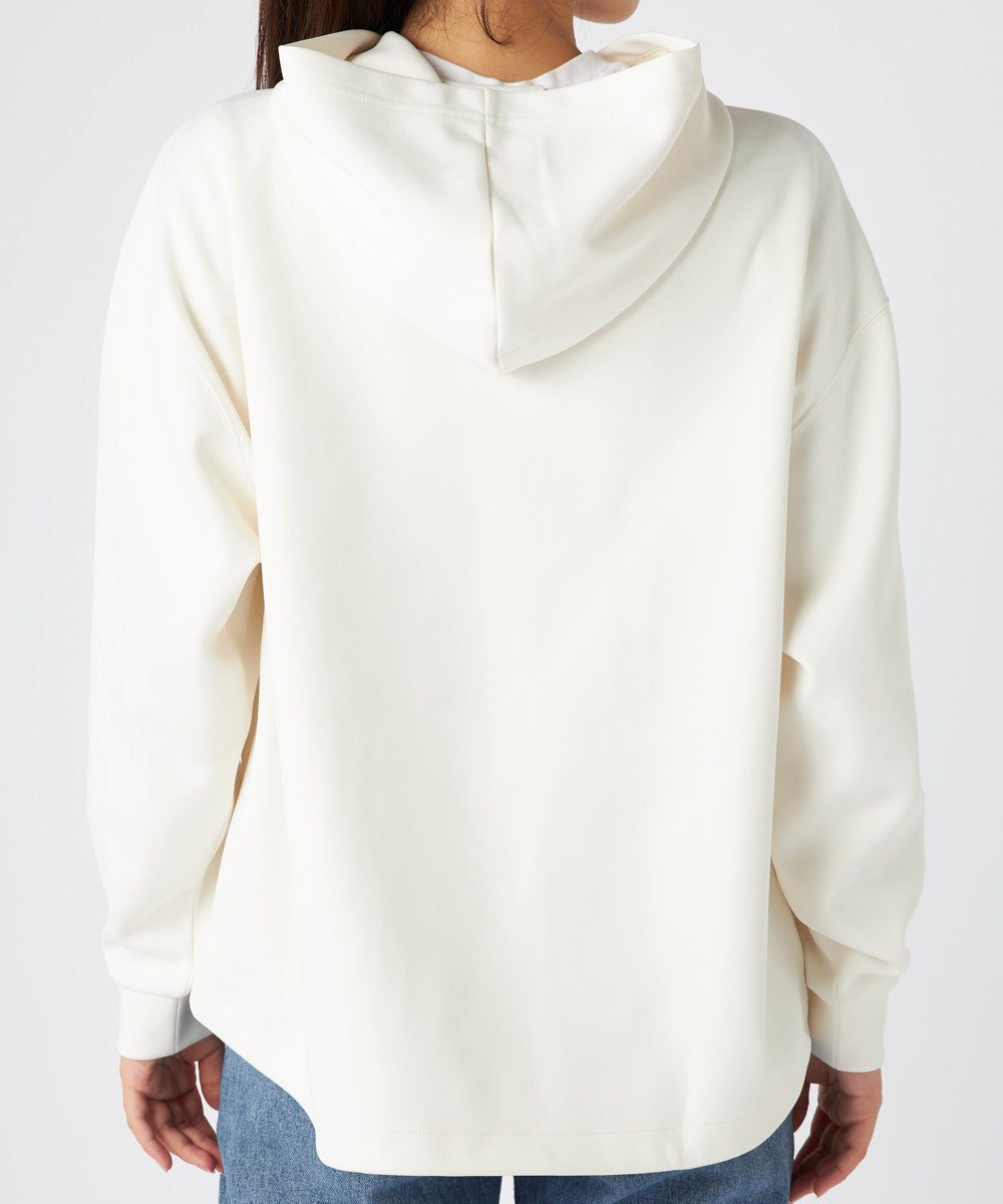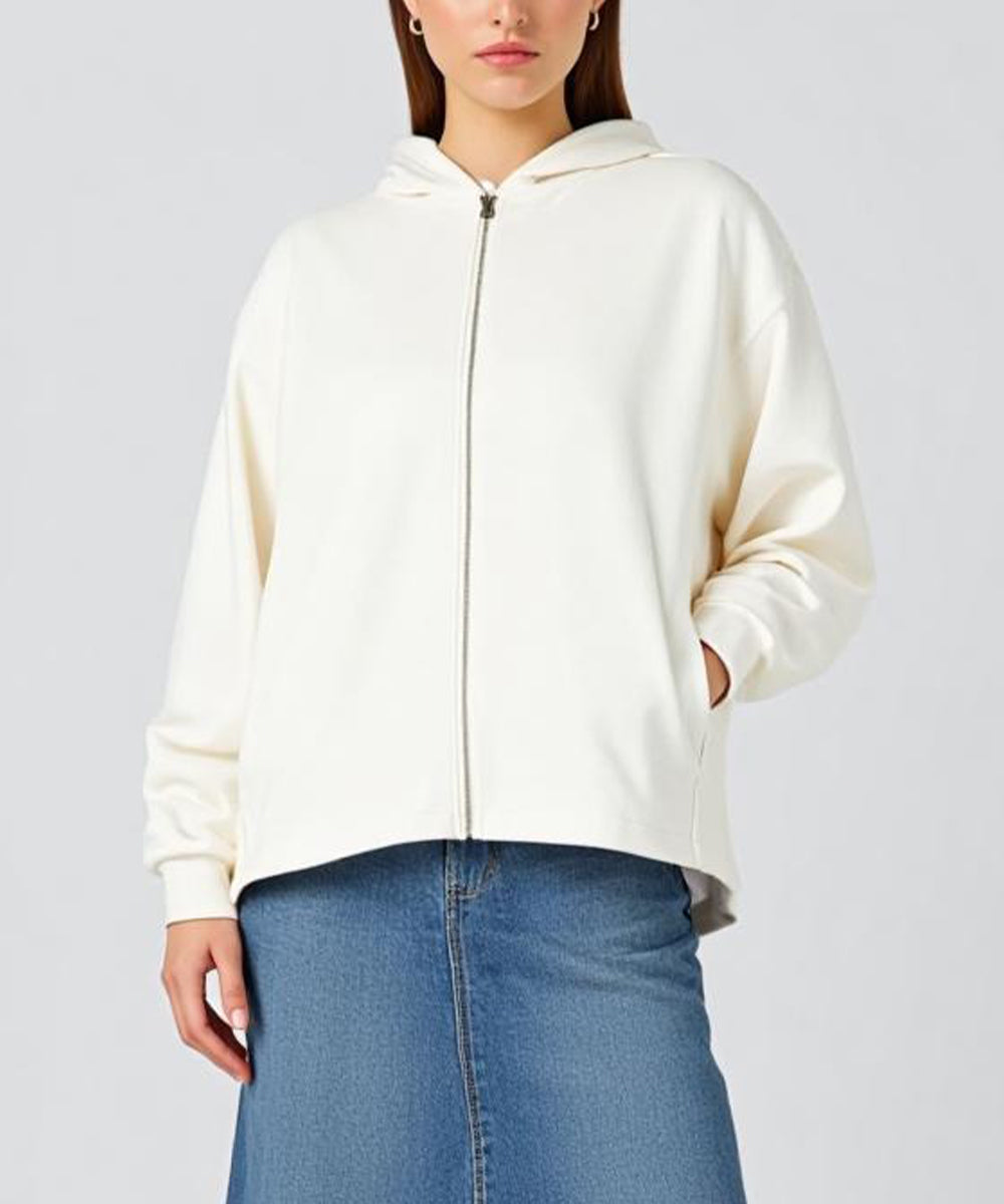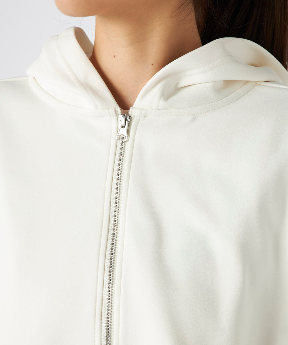 立体感×軽やかさが魅力的!ふくらみ感のあるダンボールニットを使用した、裾ドローコード付きのジップアップパーカーは大人カジュアルスタイルにぴったり◎
