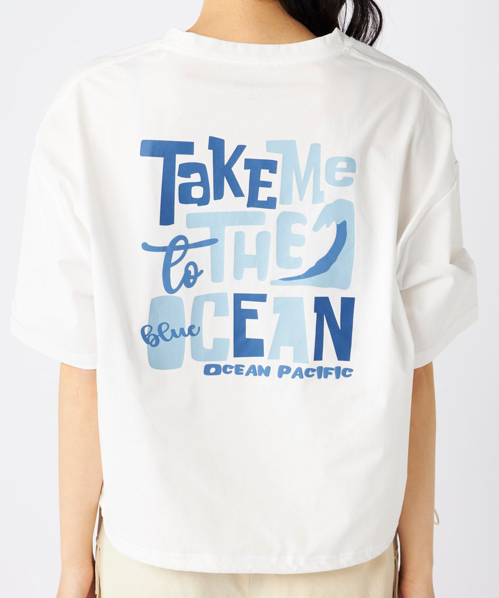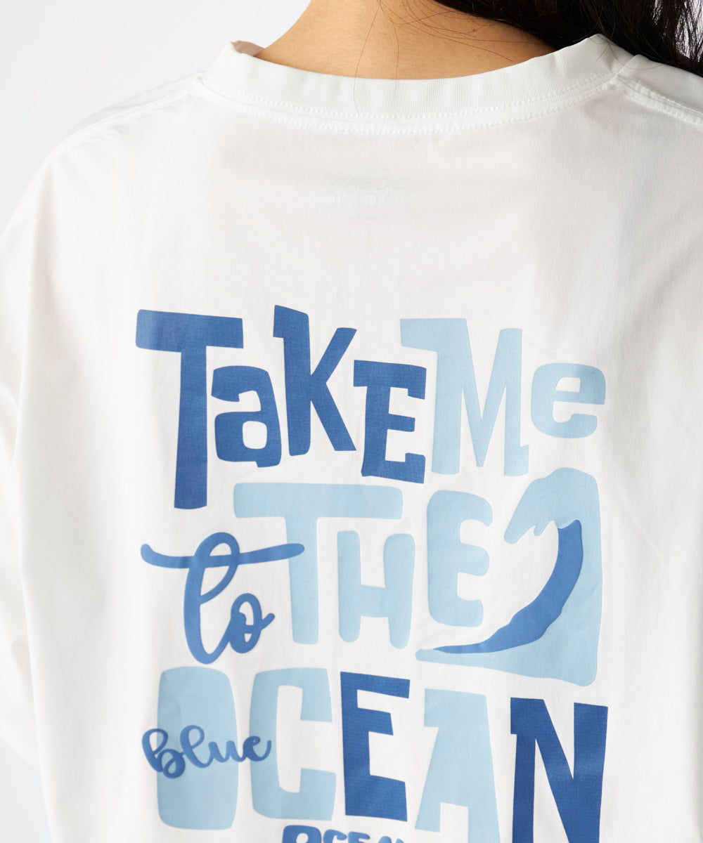 フロントはさりげないブランドロゴに、バックプリントがカラフルに大胆にはいった夏らしい水陸両用のTシャツです。