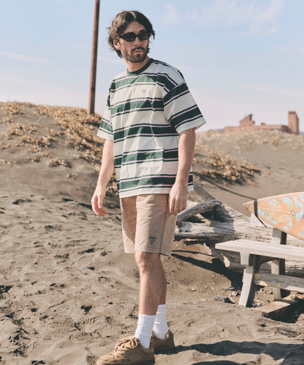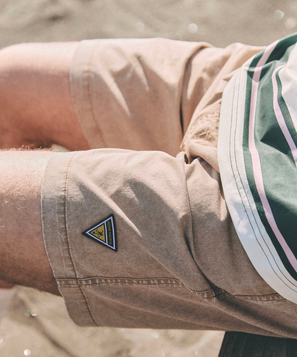 裾のワンポイントワッペンがアクセントのピグメント加工ツイルハーフパンツ。ヴィンテージ感のある風合いに適度なハリと軽やかな履き心地が魅力。海や街でラフに履きこなせ、夏にぴったりな万能アイテムです。
