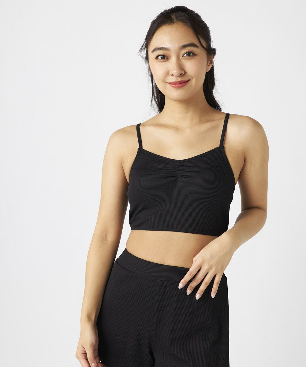 リブ素材のキャミブラトップはフィット感がありつつ、快適な着心地を実現。